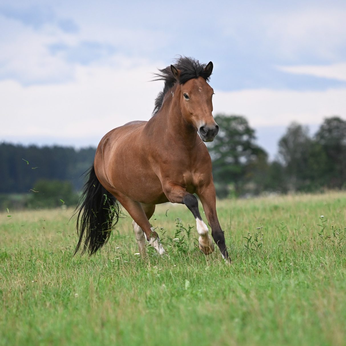 Das Fohlen wird die Grundfarbe Fuchs, Braun oder Rappe bekommen.